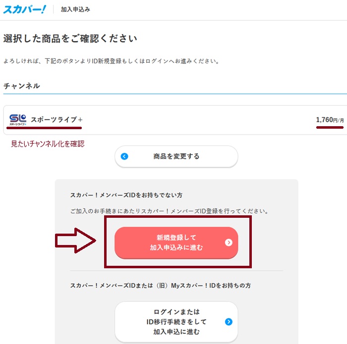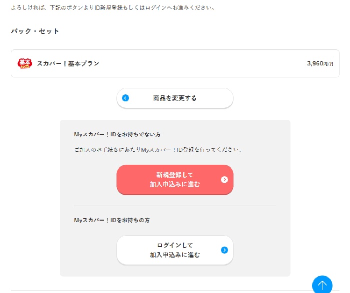 初めてで「Myスカパー!ID」を持っていないので「新規登録して加入申し込みに進む」を選択