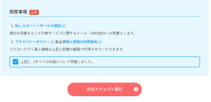 入力後上記の内容に同意するか聞かれますので、「プライバシーポリシー」「個人情報の利用目的」「Myスカパー!サービス規約」を読み同意欄にチェックして次のステップへ進む