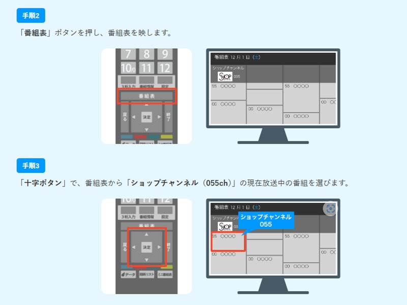 次に「十字ボタン」で番組表から「ショップチャンネル(055ch)」を選びます。