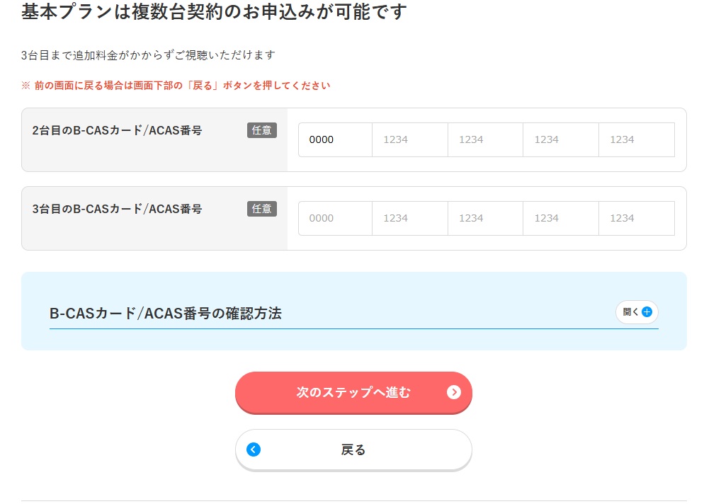 基本プランを選択した場合は、ここで2台目3台目のB-CAS/ACAS番号を入力すると3台まで追加料金がかからずご視聴できます。