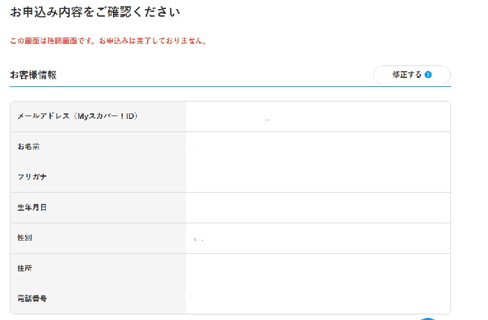 入力した内容が表示されますので、間違いがないか確認をします。