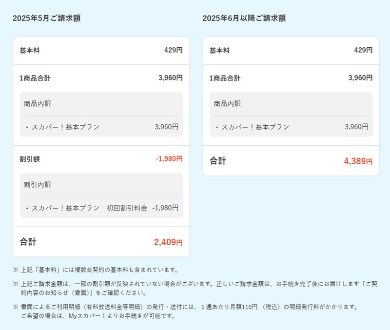 スカパーの料金体系は「基本料429円/月」+「視聴料/月」=月額料金になります。