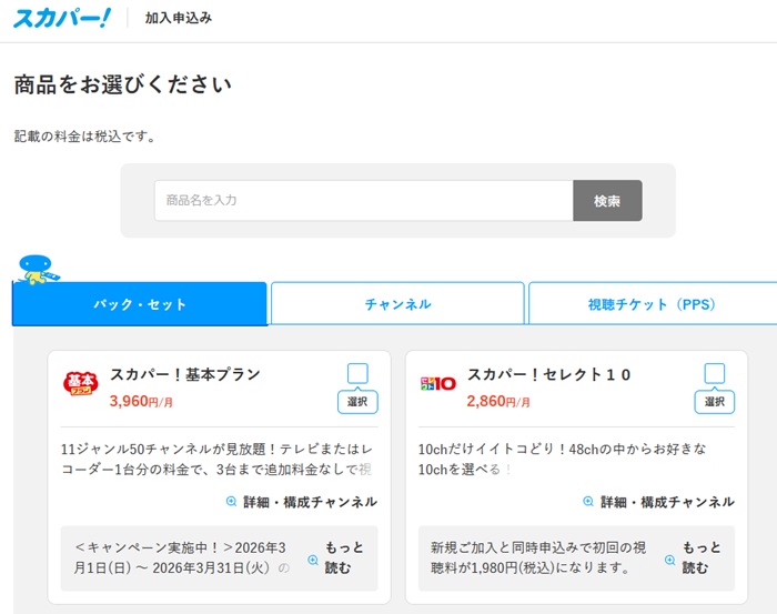 スカパー!基本プランまたはスカパー!セレクトに加入したい場合は、「パック・セット」を選択します。